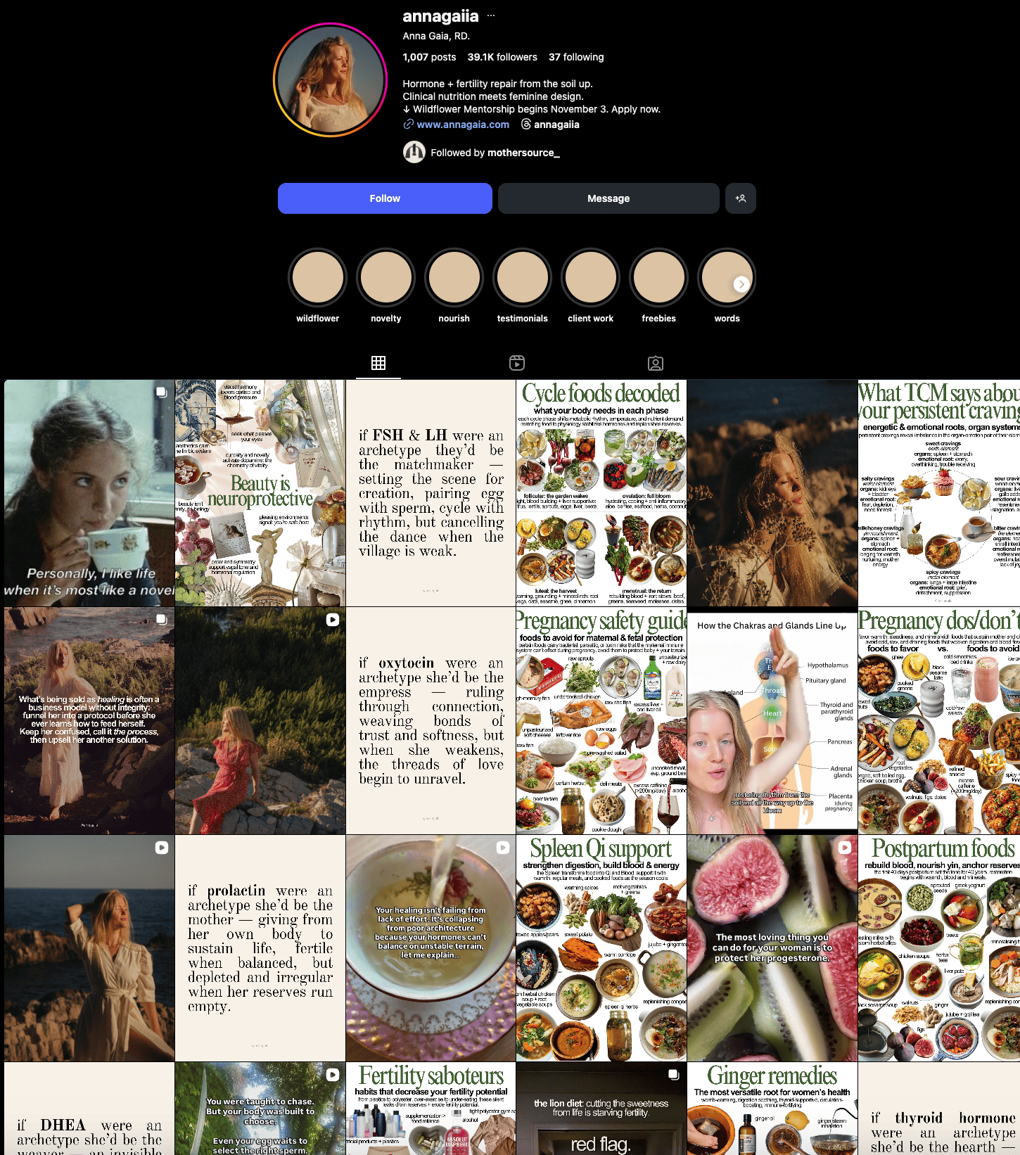 Her content on hormone and fertility repair is deeply educational, but what makes it special is the softness and poetry in her delivery. It’s not just science, it’s story. It feels like nature, like nourishment — and that consistency is doing the heavy lifting for her brand. This is the power of aesthetic alignment and expertise working together.
